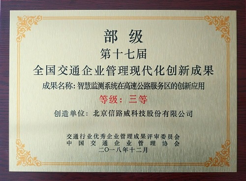近日,由中國交通企業(yè)管理協(xié)會主辦的“2018年全國交通企業(yè)管理創(chuàng)新年會”在山東濟(jì)南召開, 大會表彰了第十七屆全國交通企業(yè)管理現(xiàn)代化創(chuàng)新成果,信路威《智慧監(jiān)測系統(tǒng)在高速公路服務(wù)區(qū)的創(chuàng)新應(yīng)用》課題榮獲2018年度全國交通企業(yè)管理現(xiàn)代化創(chuàng)新成果三等獎。